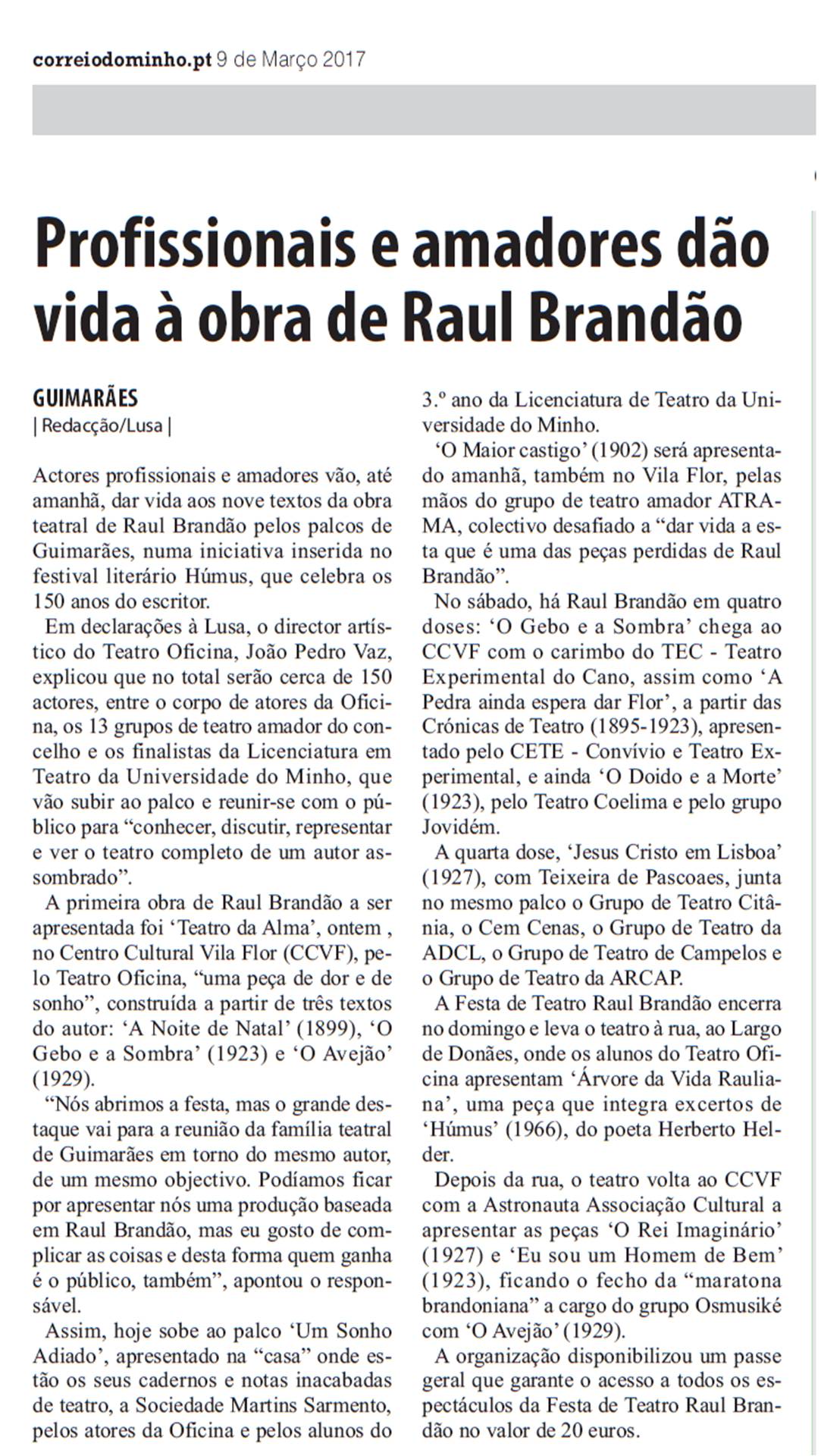 Atores profissionais e amadores vão, até sexta-feira, dar vida aos nove textos da obra teatral de Raul Brandão pelos palcos de Guimarães, numa iniciativa inserida no festival literário Húmus, que celebra os 150 anos do escritor. Em declarações à Lusa, o diretor artístico do Teatro Oficina, João Pedro Vaz, explicou que no total serão cerca de 150 atores, entre o corpo de atores da Oficina, os 13 grupos de teatro amador do concelho e os finalistas da Licenciatura em Teatro da Universidade do Minho, que vão subir ao palco e reunir-se com o público para conhecer, discutir, representar e ver o teatro completo de um autor assombrado. A primeira obra de Raul Brandão a ser apresentada vai ser Teatro da Alma, hoje, no Centro Cultural Vila Flor (CCVF), pelo Teatro Oficina, uma peça de dor e de sonho, construída a partir de três textos do autor: A Noite de Natal (1899), O Gebo e a Sombra (1923) e O Avejão (1929). Nós abrimos a festa, mas o grande destaque vai para a reunião da família teatral de Guimarães em torno do mesmo autor, de um mesmo objetivo. Podíamos ficar por apresentar nós uma produção baseada em Raul Brandão, mas eu gosto de complicar as coisas e desta forma quem ganha é o público, também, apontou o responsável. Assim, quinta-feira, sobe ao palco Um Sonho Adiado, apresentado na casa onde estão os seus cadernos e notas inacabadas de teatro, a Sociedade Martins Sarmento, pelos atores da Oficina e pelos alunos do 3.º ano da Licenciatura de Teatro da Universidade do Minho. O Maior castigo (1902) será apresentado sexta-feira, também no Vila Flor, pelas mãos do grupo de teatro amador ATRAMA, coletivo desafiado a dar vida a esta que é uma das peças perdidas de Raul Brandão. No sábado, há Raul Brandão em quatro doses: O Gebo e a Sombra chega ao CCVF com o carimbo do TEC - Teatro Experimental do Cano, assim como A Pedra ainda espera dar Flor, a partir das Crónicas de Teatro (1895-1923), apresentado pelo CETE - Convívio e Teatro Experimental, e ainda O Doido e a Morte (1923), pelo Teatro Coelima e pelo grupo Jovidém. A quarta dose, Jesus Cristo em Lisboa (1927), com Teixeira de Pascoaes, junta no mesmo palco o Grupo de Teatro Citânia, o Cem Cenas, o Grupo de Teatro da ADCL, o Grupo de Teatro de Campelos e o Grupo de Teatro da ARCAP. A Festa de Teatro Raul Brandão encerra no domingo e leva o teatro à rua, ao Largo de Donães, onde os alunos do Teatro Oficina apresentam Árvore da Vida Rauliana, uma peça que integra excertos de Húmus (1966), do poeta Herberto Helder. Depois da rua, o teatro volta ao CCVF com a Astronauta Associação Cultural a apresentar as peças O Rei Imaginário (1927) e Eu sou um Homem de Bem (1923), ficando o fecho da maratona brandoniana a cargo do grupo Osmusiké com O Avejão (1929). A organização disponibilizou um passe geral que garante o acesso a todos os espetáculos da Festa de Teatro Raul Brandão no valor de 20 euros.